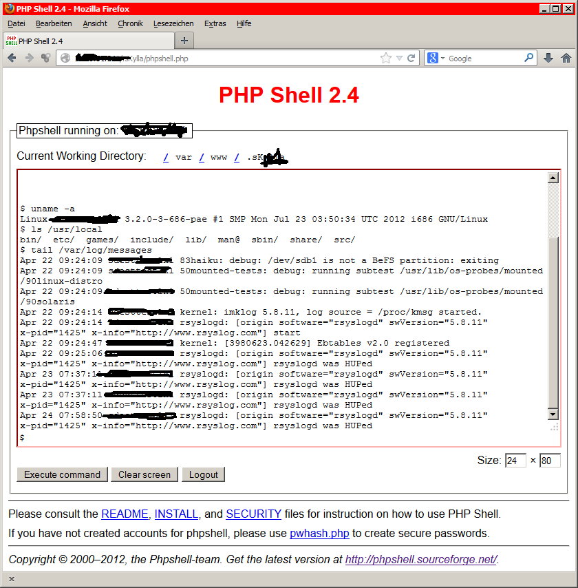 Jetzt kann man sich erneut an der https://meinserver/daten/muell/.Aiw1VwdaAs/phpshell.php anmelden.
